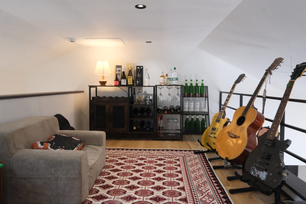 好きなものに囲まれて、静かにこもる時間。音楽を流し、ギターに触れ、グラスに一杯を注ぐ。